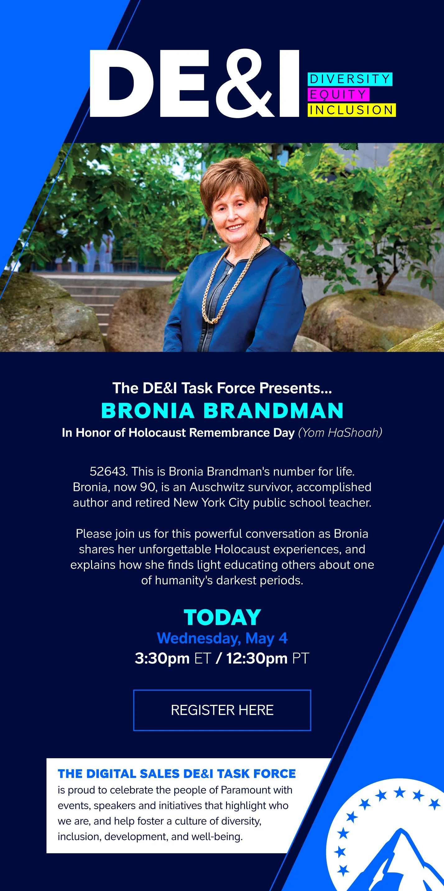I produced and managed a powerful virtual conversation in honor of Holocaust Remembrance Day (Yom HaShoah), hosted by the Paramount Digital Sales DE&I Task Force. The event featured Bronia Brandman, a 90-year-old Auschwitz survivor, accomplished author, and retired New York City public school teacher, who courageously shared her personal Holocaust experiences.